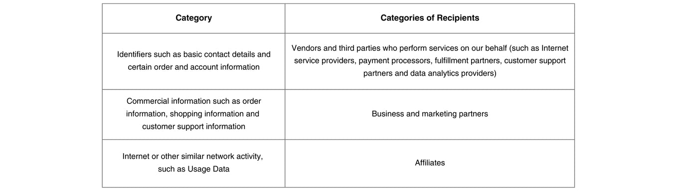 - Service Providers: Companies that support our Site and Services, such as Shopify.