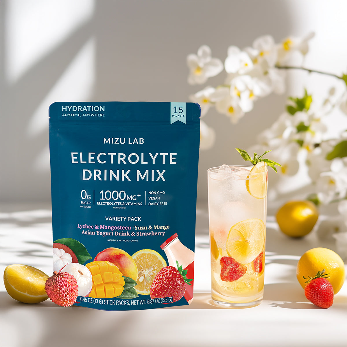 Hydrate your day with our zero-sugar drink mix, featuring three delicious flavors: Lychee & Mangosteen, Yuzu & Mango, and Asian Yogurt Drink & Strawberry. Each pouch includes 15 sticks, each packed with over 1,000mg of electrolytes and essential vitamins — all without the sugar.